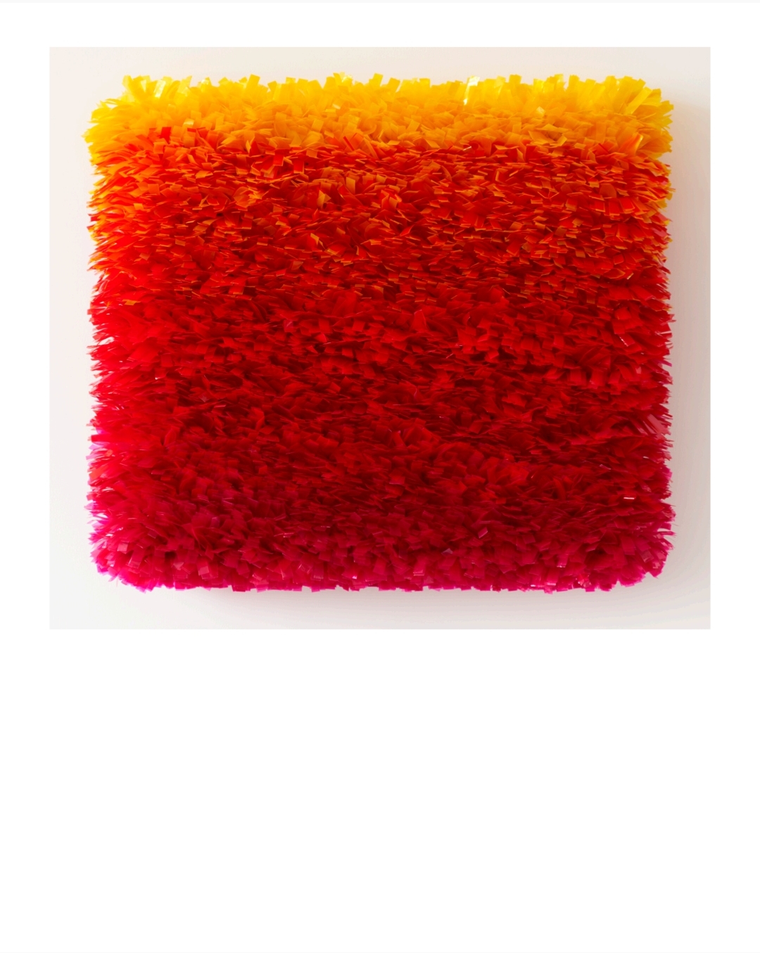 Monika Radhoff-Troll verwendet Plastiktüten für ihre installativen Objekte, indem sie diese in schmale Streifen zerschneidet und neu zusammensetzt. Tüten von The New York Times, Monopol oder Washington Post werden in handwerklicher Tradition aufwendig geknüpft und so zu zeitgenössischen Formen eines Wandteppichs oder Kissens verwandelt. Farbenprächtig bunt oder in monochromen Tönen, werden die ehemaligen Plastiktüten zu neuen, sinnlich erfahrbaren Objekten, deren kommerzieller Ursprung kaum mehr erkennbar ist. Einstige Werbeaufdrücke oder Logos sind derart dechiffriert und fragmentarisiert, dass ihre ursprünglichen Botschaften oft erst auf den zweiten Blick deutlich werden.