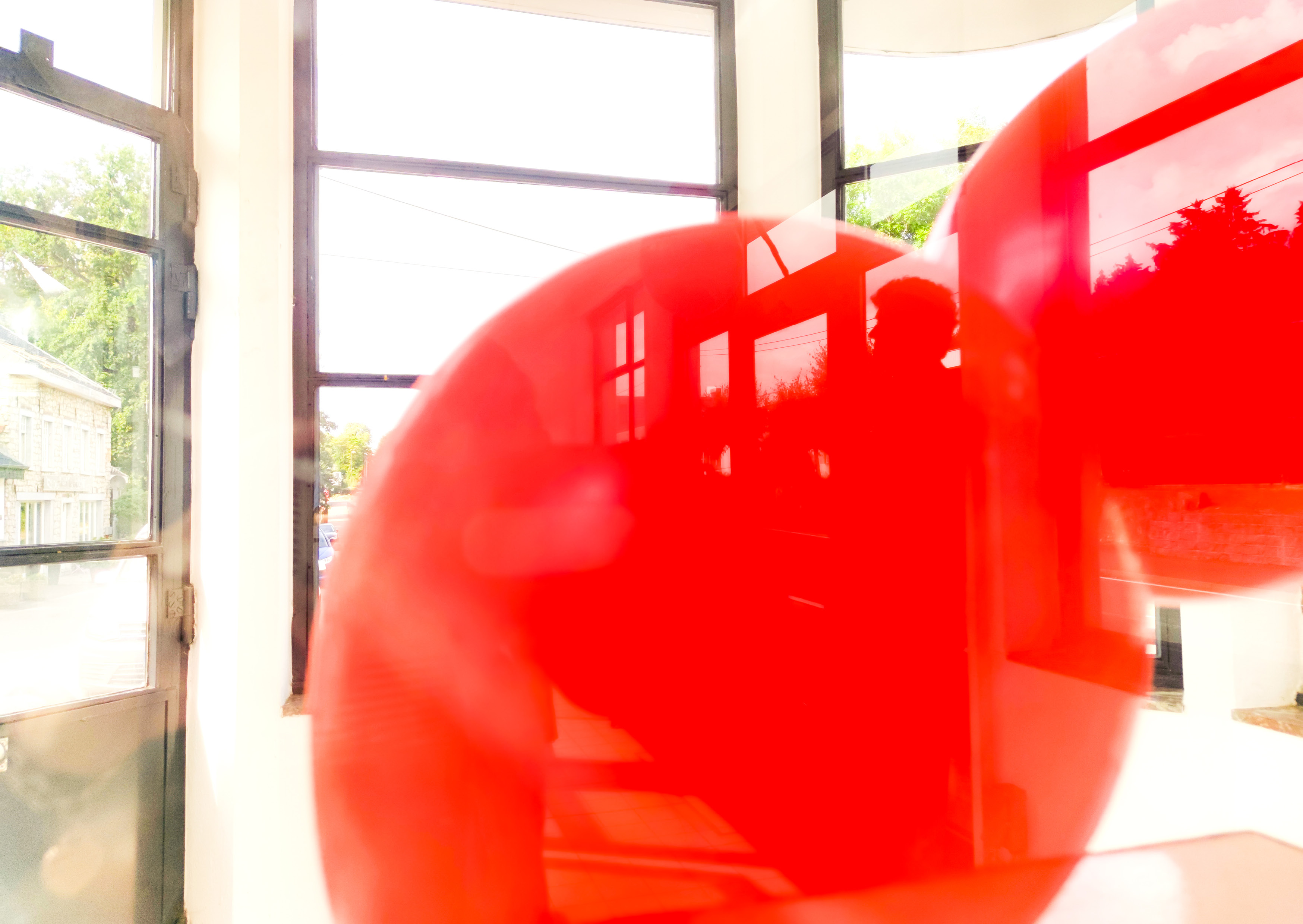 Die Installation im Belgischen Zollhäuschen spielt mit der Begrenzung von Interieur zu Exterieur – durch die Zirkulation und Bewegung der Ballons im Inneren entsteht ein lebendiges Wesen, welches nach Außen dringt. Die Erfahrung der Grenze bleibt dynamisch, spielt sich zwischen Leichtigkeit und Schwere ab. Denn die Grenze zum Innenraum, einsehbar doch nicht überwindbar, nur von Außen zugänglich, wird durch einzelne Elemente aufgebrochen und ermöglicht so neue Perspektiven.