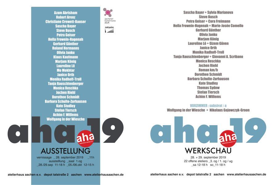 Zur 22. Aachener Kunstroute öffnet das Atelierhaus erneut Tür und Tor und gibt Einblicke in Ideen, Positionen und Arbeitsweisen der 30 Künstler des Hauses. Im Ausstellungssaal im 1.OG werden neue Arbeiten gezeigt. In offenen Ateliers laden die aha-Künstler mit der Beteiligung von 6 Gastkünstlern zu Begegnung und Austausch ein.