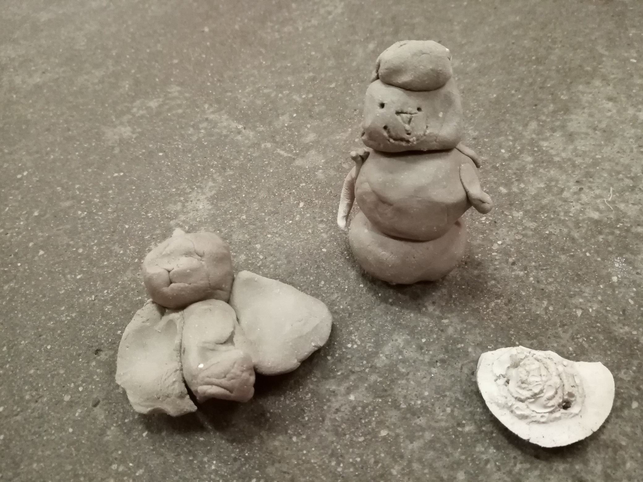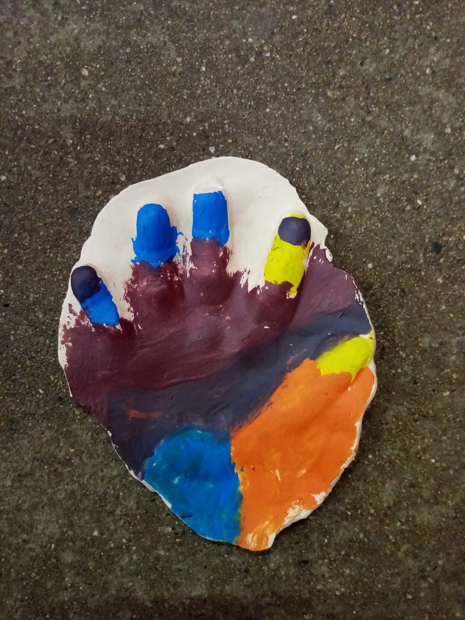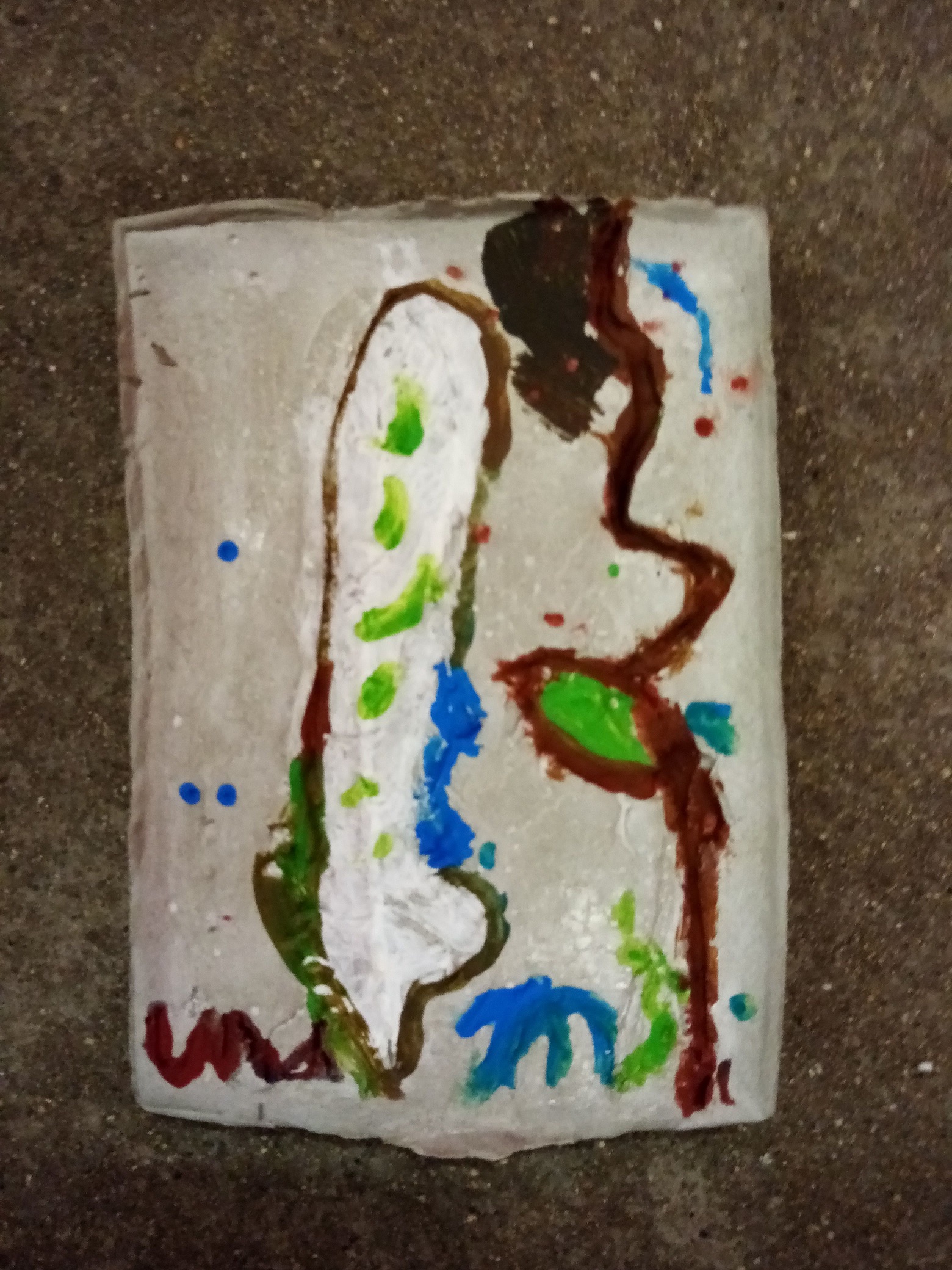 Während der Arbeit im Workshopraum erstellten die Teilnehmenden im Laufe der Woche unter Anleitung von Kate Studley und Sascha Bayer Druckvorlagen aus Moosgummi und ähnlichen Materialien, außerdem lernten sie, wie sich Fundobjekte, aber auch Körperteile (Hände) in Gussmaterialien wie Ton, Gips und Zement abgießen und -drucken lassen. Dabei waren Experimente durchaus erwünscht. Die Kinder konnten sich in der künstlerischen Arbeit mit unterschiedlichen Materialien erproben und entdecken, wie sich die Materialien verhalten und welche Möglichkeiten des Druckens und Verarbeitens sie in sich bergen. Immer möglich war darüber hinaus das Zeichnen und das Malen mit Acrylfarben.